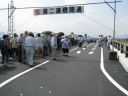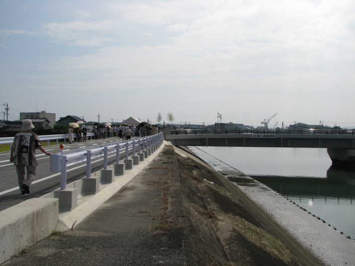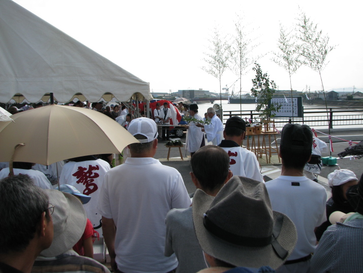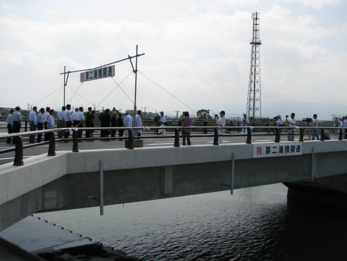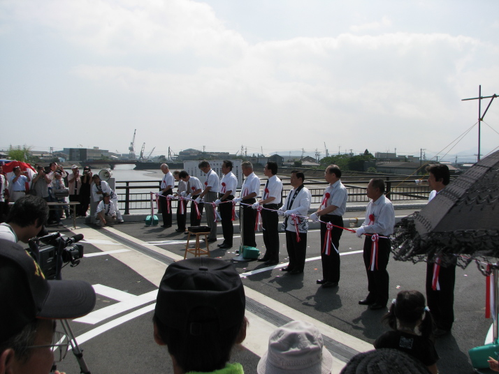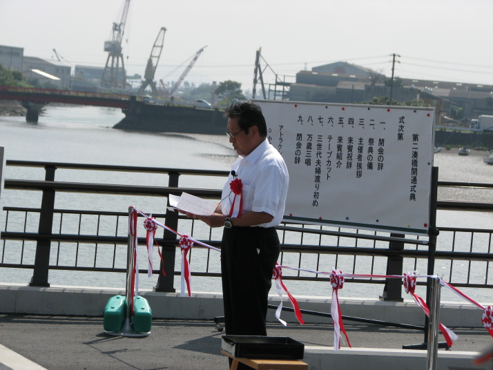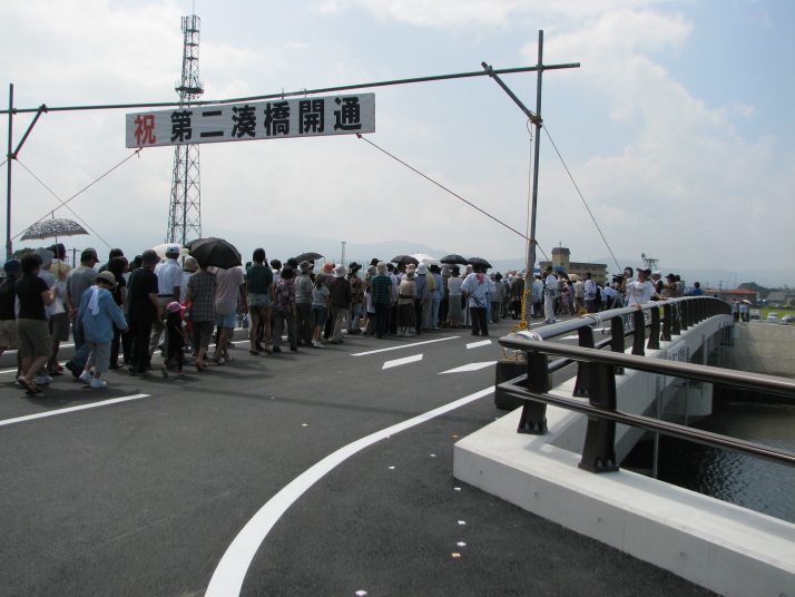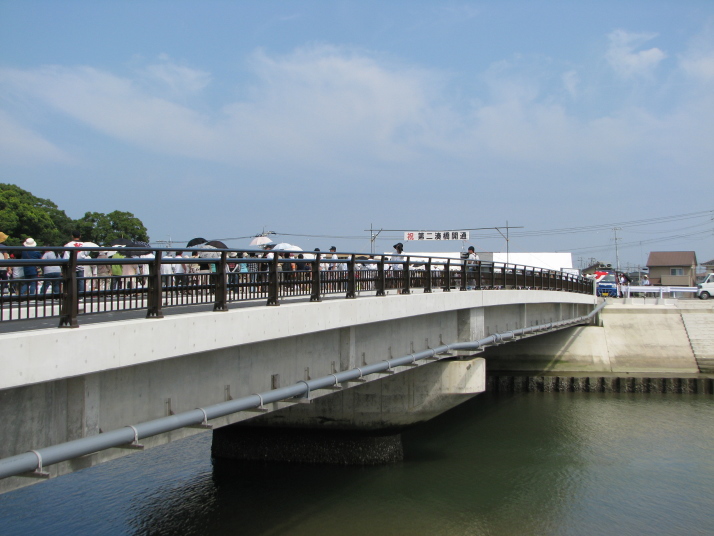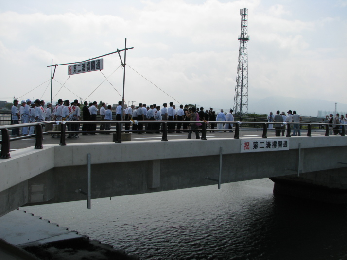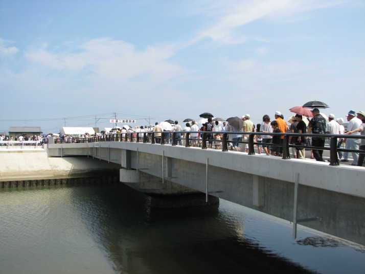 私の住む伊勢市大湊町と言うところは、宮川と瀬田川の中洲に出来た土地で、 あたかも長崎の出島のように川(運河)で陸と隔てられています。 今までは、湊橋という橋1本で繋がっており、万一地震等でこの橋が壊れたら、 オイラの豪華大型客船が大活躍する環境にありました。((笑)) このたび、その脅威を解消する住民悲願であった第二湊橋が完成し、竣工式渡り初めが行われました。