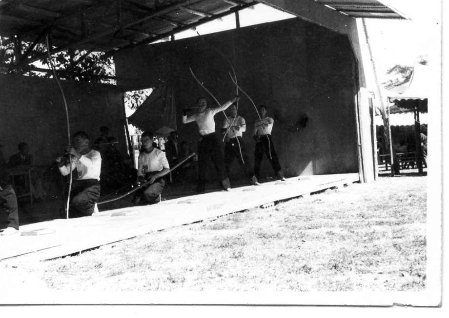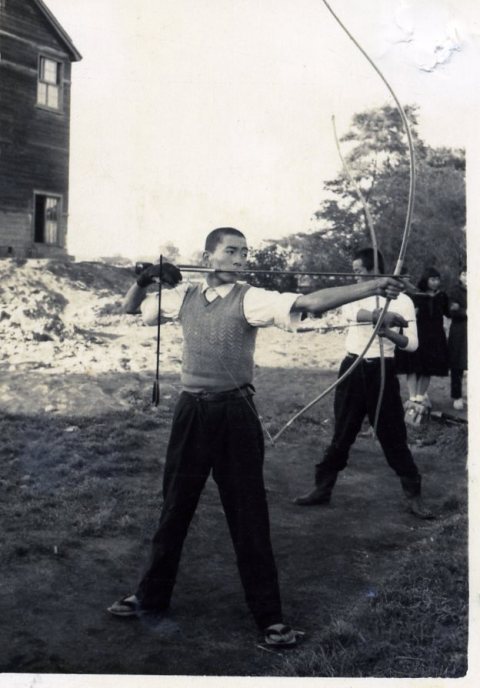 南ヶ丘高の弓道場で、何と下駄を履いているよ! |